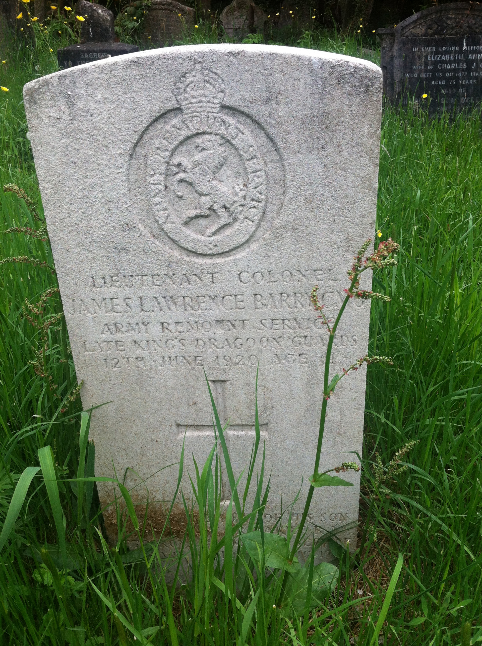 An unusual headstone commemorating 61-year-old lieutenant colonel James Barry of the Army Remount Service, formerly of the King’s Dragoon Guards.