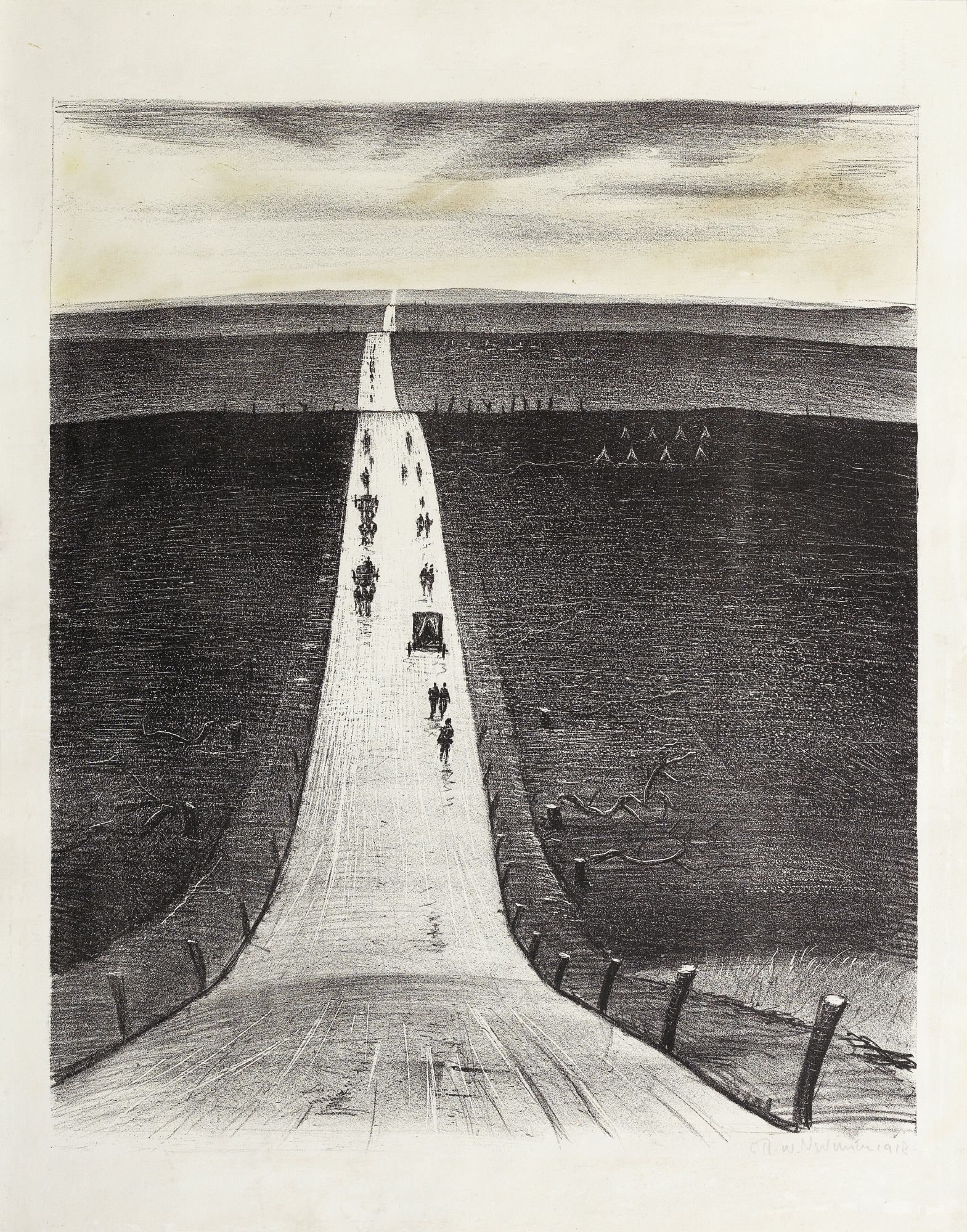 Other Nevinson wartime works include Loading the Ship, a 1917 lithograph showing soldiers loading cargo (estimated at £30,000-£50,000) and The Road from Arras to Bapaume of 1918 (estimated £30,000-50,000), showing a never-ending road stretching uphill into the grey distance.